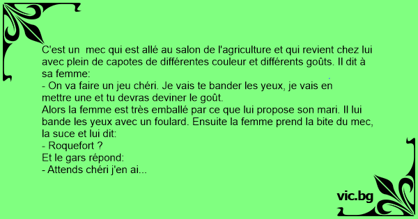 C'est un  mec qui est allé au salon de l'agriculture et qui revient chez lui avec plein de capotes de différentes couleur et différents goûts. Il dit à sa femme:
