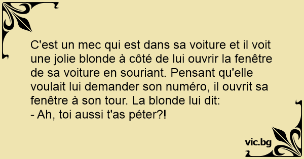Un mec roule en voiture. Il s'arrête à un feu rouge et voit une fille blonde dans une autre voiture à côté de la sienne. La blonde le regarde en souriant. Le mec ouvre la vitre de sa voiture...