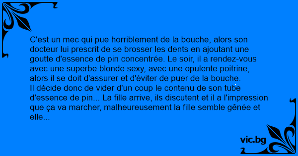 C'est un mec qui pue horriblement de la bouche, alors son docteur lui prescrit de se brosser les dents en ajoutant une goutte d'essence de pin concentrée. Le soir, il a rendez-vous avec une superbe blonde sеxy, avec une opulente poitrine, alors il se doit d'assurer et d'éviter de puer de la bouche.