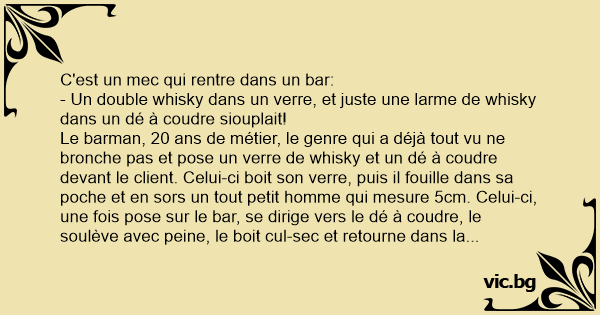 Le barman, 20 ans de métier, le genre qui a déjà tout vu ne bronche pas et pose un verre de whisky et un dé à coudre devant le client. Celui-ci boit son verre, puis il fouille dans sa poche et en sors un tout petit homme qui mesure 5cm. Celui-ci, une fois pose sur le bar, se dirige vers le dé à coudre, le soulève avec peine, le boit cul-sec et retourne dans la poche du premier. Le barman est complètement estomaque par ce qu'il vient de voir: