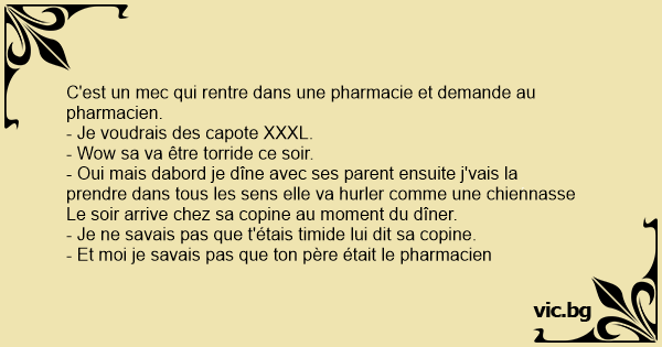 Un jour, un adolescent de 16 ans rentre dans une phamarcie et demande : - Un préservatif s'il vous plait, je vais chez ma copine ce soir et je sais qu'elle attend quelque chose de moi. Le...