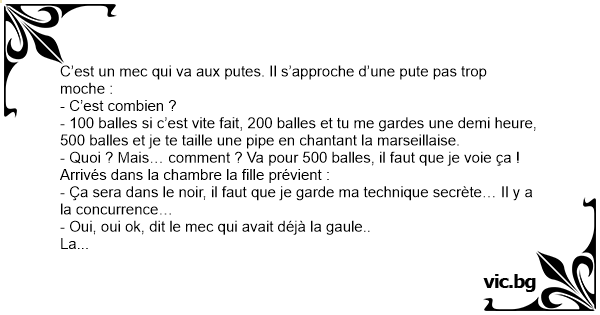- 100 balles si c’est vite fait, 200 balles et tu me gardes une demi heure, 500 balles et je te taille une pipe en chantant la marseillaise.
