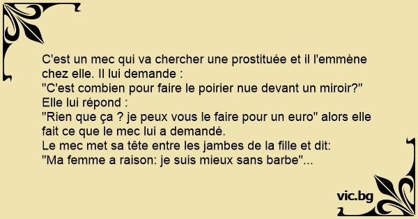 C'est un mec qui va chercher une prostituée et il l'emmène chez elle. Il lui demande : "C'est combien pour faire le poirier nue devant un miroir?" Elle lui répond : "Rien que ça ? je peux vous le faire pour un euro" alors elle fait ce que le mec lui a demandé. Le mec met sa tête entre les jambes de la fille et dit: "Ma femme a raison: je suis mieux sans barbe"...