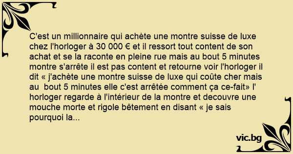 C'est un millionnaire qui achète une montre suisse de luxe chez l'horloger à 30 000 € et il ressort tout content de son achat et se la raconte en pleine rue mais au bout 5 minutes montre s'arrête il est pas content et retourne voir l'horloger il dit « j'achète une montre suisse de luxe qui coûte cher mais au bout 5 minutes elle c'est arrêtée comment ça ce-fait» l' horloger regarde à l'intérieur de la montre et decouvre une mouche morte et rigole bêtement en disant « je sais pourquoi la montre ne fonctionnait pas le machiniste c'est suicidée.»