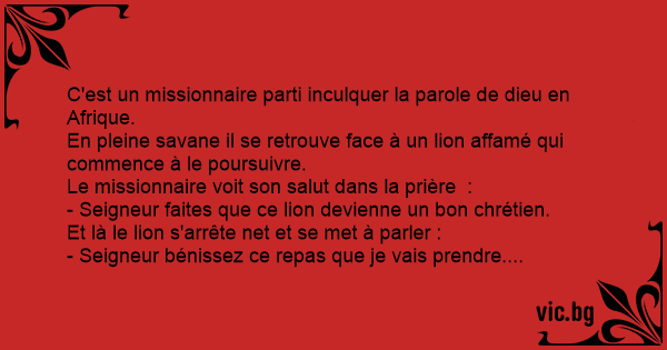 Il était une fois un explorateur qui tomba devant un lion. L'explorateur apeuré dit : - Dieu, faites que ce lion est une pensée Chrétienne. Et le lion répondis : - Dieu, bénissez ce repas.