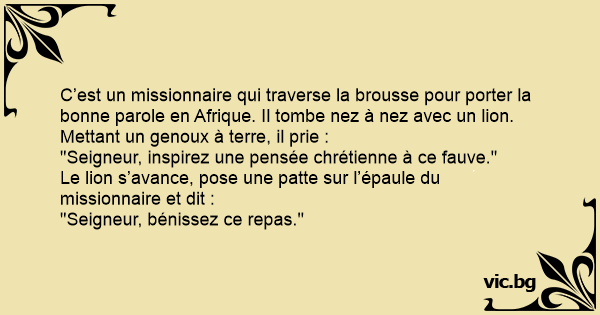 C’est un missionnaire qui traverse la brousse pour porter la воnnе parole en Afrique. Il tombe nez à nez avec un lion.