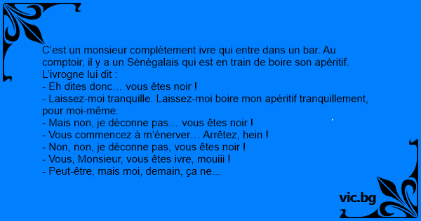 C’est un monsieur complètement ivre qui entre dans un bar. Au comptoir, il y a un Sénégalais qui est en train de boire son apéritif. L’ivrogne lui dit :