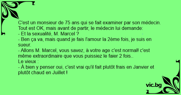 C'est un monsieur de 75 ans qui se fait examiner par son médecin. Tout est OK, mais avant de partir, le médecin lui demande: