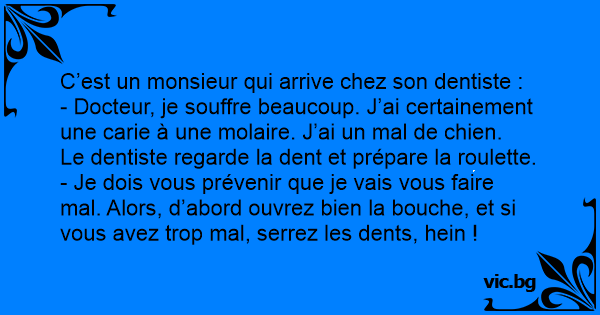 - Docteur, je souffre beaucoup. J’ai certainement une carie à une molaire. J’ai un mal de chien.