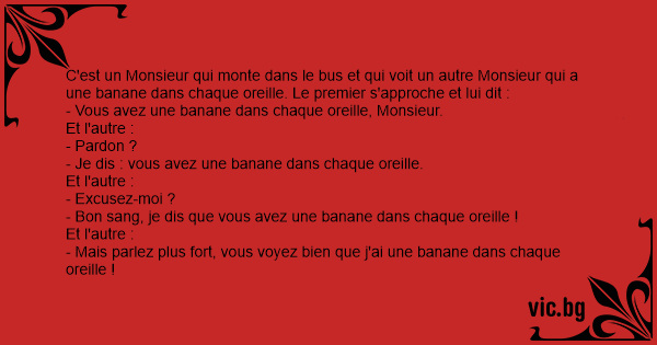 C'est un Monsieur qui monte dans le bus et qui voit un autre Monsieur qui a une banane dans chaque oreille. Le premier s'approche et lui dit :