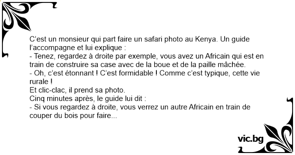 C’est un monsieur qui part faire un safari photo au Kenya. Un guide l’accompagne et lui explique :