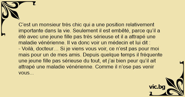 - Voilà, docteur… Si je viens vous voir, ce n’est pas pour moi mais pour un de mes amis. Depuis quelque temps il fréquente une jeune fille pas sérieuse du tout, et j’ai bien peur qu’il ait attrapé une maladie vénérienne. Comme il n’ose pas venir vous voir, qu’est-ce qu’il doit faire ?
