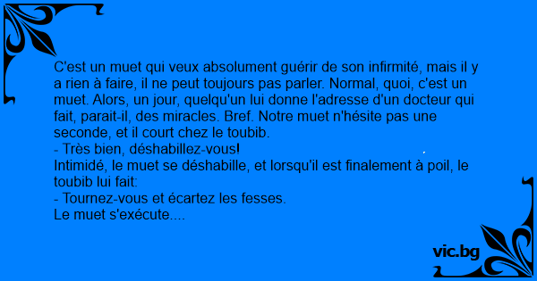 C'est un muet qui veux absolument guérir de son infirmité, mais il y a rien à faire, il ne peut toujours pas parler. Normal, quoi, c'est un muet. Alors, un jour, quelqu'un lui donne l'adresse d'un docteur qui fait, parait-il, des miracles. Bref. Notre muet n'hésite pas une seconde, et il court chez le toubib.