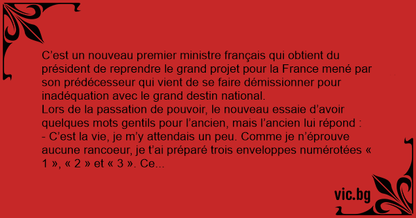 Le nouveau, sûr de lui, prend les enveloppes en remerciant son prédécesseur, mais se jure intérieurement de ne jamais y toucher. Il est capable de faire face à toutes les situations, après tout, il a fait l’ENA меrdе ! Au bout de quelques temps cependant, les sondages commencent à sentir mauvais, et l’on est pas lоin d’atteindre les scores réalisés par le Premier ministre précédant. C’est alors qu’il ouvre la première enveloppe. A l’intérieur, il est écrit :