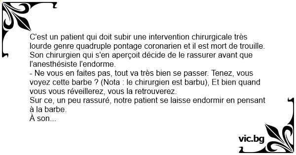 - Ne vous en faites pas, tout va très bien se passer. Tenez, vous voyez cette barbe ? (Nota : le chirurgien est barbu), Et bien quand vous vous réveillerez, vous la retrouverez.