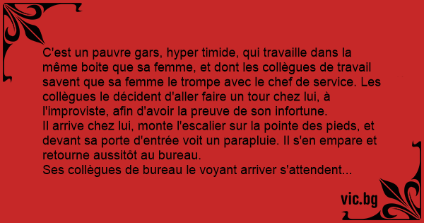 C'est un pauvre gars, hyper timide, qui travaille dans la même boite que sa femme, et dont les collègues de travail savent que sa femme le trompe avec le chef de service. Les collègues le décident d'aller faire un tour chez lui, à l'improviste, afin d'avoir la preuve de son infortune.