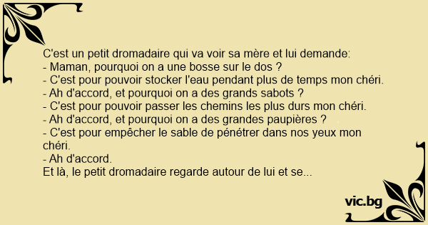 C'est un petit dromadaire qui va voir sa mère et lui demande: