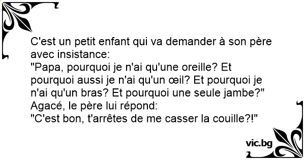 "Papa, pourquoi je n'ai qu'une oreille? Et pourquoi aussi je n'ai qu'un œil? Et pourquoi je n'ai qu'un bras? Et pourquoi une seule jambe?"