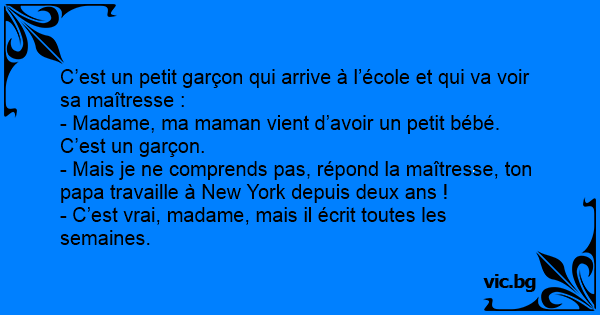 - Mais je ne comprends pas, répond la maîtresse, ton papa travaille à New York depuis deux ans !