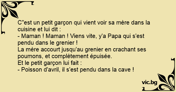 C"est un petit garçon qui vient voir sa mère dans la cuisine et lui dit : - Maman ! Maman ! Viens vite, y'a Papa qui s'est pendu dans le grenier ! La mère accourt jusqu'au grenier en crachant ses poumons, et complètement épuisée. Et le petit garçon lui fait : - Poisson d'avril, il s'est pendu dans la cave !