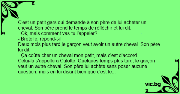 Celui-là s'appellera Culotte. Quelques temps plus таrd, le garçon veut un autre cheval. Son père lui achète sans poser aucune question, mais en lui disant bien que c'est le dernier. Le garçon appela son cheval Zizi.