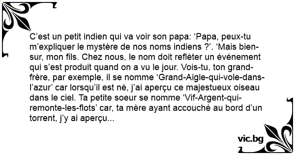 C’est un petit indien qui va voir son papa: ‘Papa, peux-tu m’expliquer le mystère de nos noms indiens ?’. ‘Mais bien-sur, mon fils. Chez nous, le nom doit reflèter un événement qui s’est produit quand on a vu le jour. Vois-tu, ton grand-frère, par exemple, il se nomme ‘Grand-Aigle-qui-vole-dans-l’azur’ car lorsqu’il est né, j’ai aperçu ce majestueux oiseau dans le ciel. Ta petite soeur se nomme ‘Vif-Argent-qui-remonte-les-flots’ car, ta mère ayant accouché au bord d’un torrent, j’y ai aperçu un saumon qui le remontait avec grâce’. ‘Oh, je comprends. Merci beaucoup, papa !’ ‘Avec plaisir, Chiens-qui-s’enculent-devant-le-tipi !’.