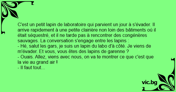 - Hé, salut les gars, je suis un lapin du labo d'à côté. Je viens de m'évader. Et vous, vous êtes des lapins de garenne ?