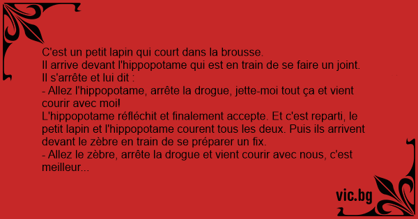 L'hippopotame réfléchit et finalement accepte. Et c'est reparti, le petit lapin et l'hippopotame courent tous les deux. Puis ils arrivent devant le zèbre en train de se préparer un fix.
