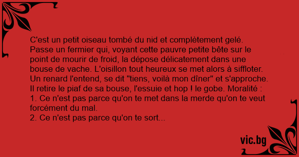 C'est un petit oiseau tombé du nid et complètement gelé. Passe un fermier qui, voyant cette pauvre petite bête sur le point de mourir de froid, la dépose délicatement dans une bouse de vache. L'oisillon tout heureux se met alors à siffloter. Un renard l'entend, se dit "tiens, voilà mon dîner" et s'approche. Il retire le piaf de sa bouse, l'essuie et hop ! le gobe. Moralité :