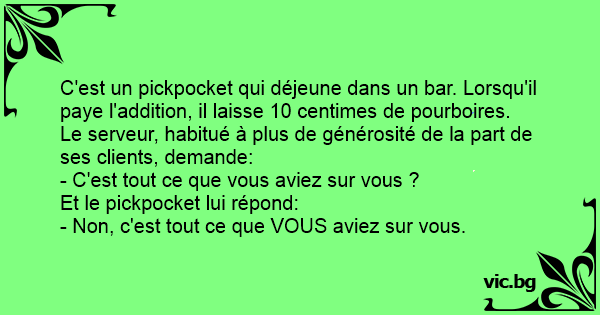 C'est un pickpocket qui déjeune dans un bar. Lorsqu'il paye l'addition, il laisse 10 centimes de pourboires.