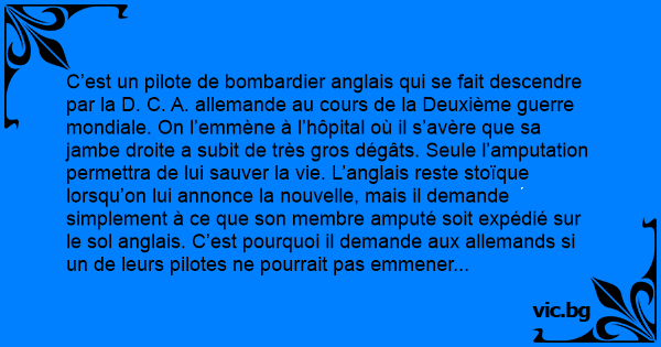 Une semaine plus таrd, il s’avère que la main du pilote anglais est sérieusement contaminée par un staphylocoque doré de la pire espèce. Une fois encore, la seule option est l’amputation. Comme la première fois, le pilote anglais est d’accord sous réserve que la main soit balancée sur le sol anglais.