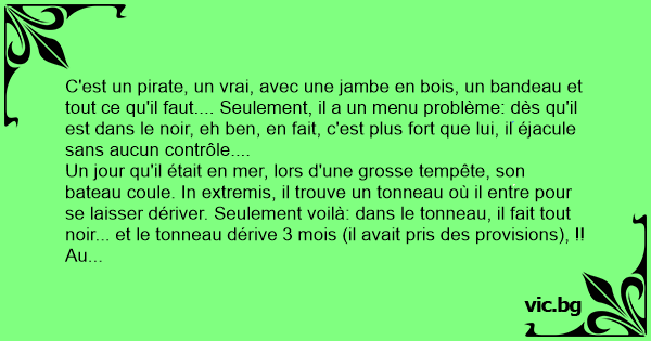 C'est un pirate, un vrai, avec une jambe en bois, un bandeau et tout ce qu'il faut.... Seulement, il a un menu problème: dès qu'il est dans le noir, eh ben, en fait, c'est plus fort que lui, il éjacule sans aucun contrôle....