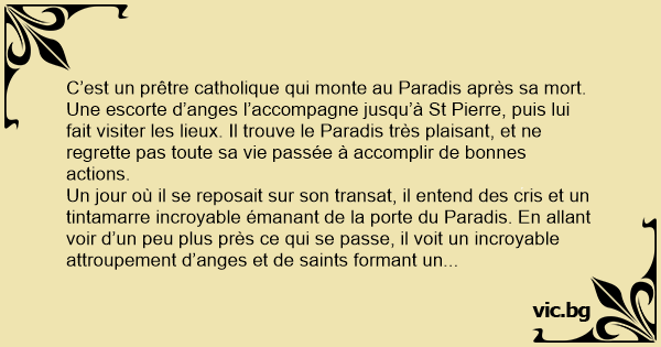 Un jour où il se reposait sur son transat, il entend des cris et un tintamarre incroyable émanant de la porte du Paradis. En allant voir d’un peu plus près ce qui se passe, il voit un incroyable attroupement d’anges et de saints formant un nuage blanc au dessus des portes de l’Eden. L’orchestre du Paradis est même arrivé sur place, et c’est une liesse comme le prêtre n’en avait jamais vue, même ici au Paradis.