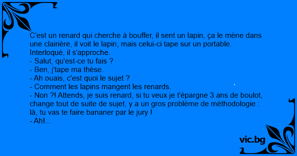 - Non ?! Attends, je suis renard, si tu veux je t'épargne 3 ans de boulot, change tout de suite de sujet, y a un gros problème de méthodologie : là, tu vas te faire bananer par le jury !