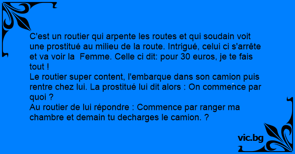 C'est un routier qui arpente les routes et qui soudain voit une prostitué au milieu de la route. Intrigué, celui ci s'arrête et va voir la Femme. Celle ci dit: pour 30 euros, je te fais tout !