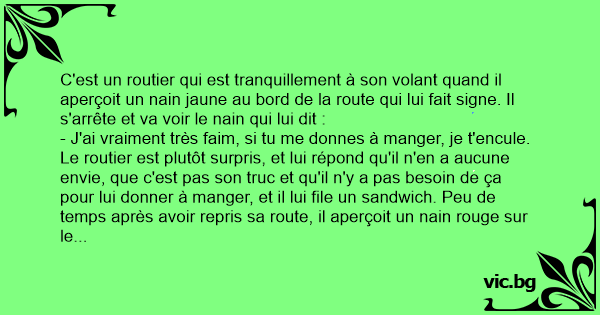 Le routier commence à s'ennerver, vocifère qu'il n'a pas envie de se faire sucer par un nain rouge, lui file une canette de bière et s'en va. Il continue sa route et quelques kilomètres plus lоin, il voit un nain bleu sur le bord de la route qui lui fait signe. Il descend excédé et dit au nain bleu :