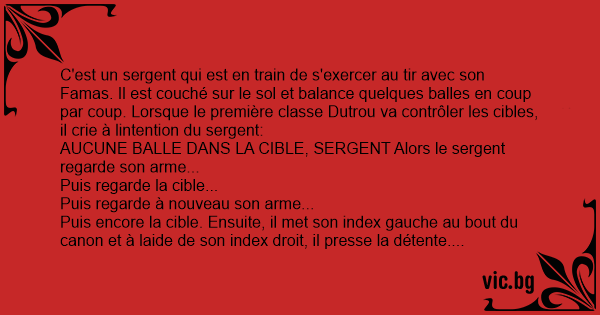 C'est un sergent qui est en train de s'exercer au tir avec son Famas. Il est couché sur le sol et balance quelques balles en coup par coup. Lorsque le première classe Dutrou va contrôler les cibles, il crie à lintention du sergent: