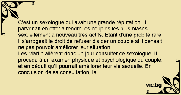 Les Martin allèrent donc un jour consulter ce sexologue. Il procéda à un examen physique et psychologique du couple, et en déduit qu'il pourrait améliorer leur vie sexuelle. En conclusion de sa consultation, le sexologue dit aux époux Martin :
