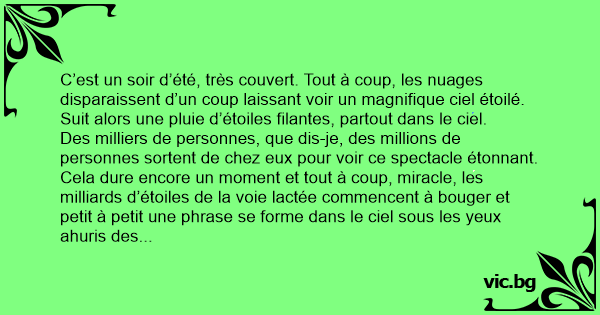 Cela dure encore un moment et tout à coup, miracle, les milliards d’étoiles de la voie lactée commencent à bouger et petit à petit une phrase se forme dans le ciel sous les yeux ahuris des terriens :