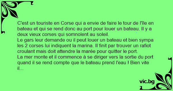 C'est un touriste en Corse qui a envie de faire le tour de l'île en bateau et qui se rend donc au port pour louer un bateau. Il y a deux vieux corses qui somnolent au soleil.