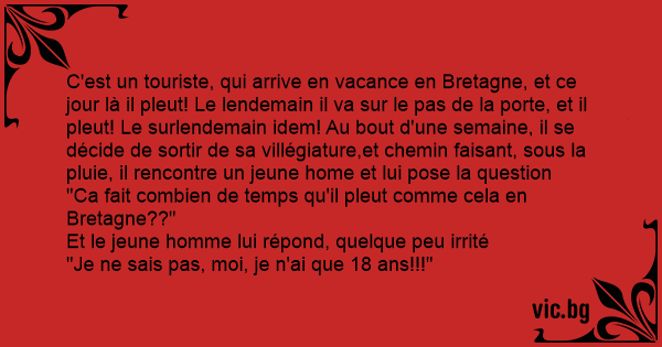 C'est un touriste, qui arrive en vacance en Bretagne, et ce jour là il pleut! Le lendemain il va sur le pas de la porte, et il pleut! Le surlendemain idem! Au bout d'une semaine, il se décide de sortir de sa villégiature,et chemin faisant, sous la pluie, il rencontre un jeune home et lui pose la question