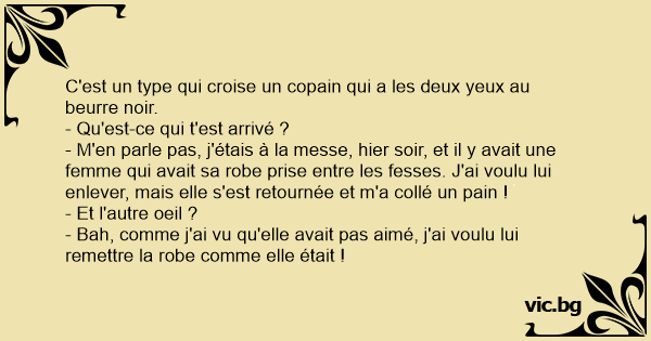 - M'en parle pas, j'étais à la messe, hier soir, et il y avait une femme qui avait sa robe prise entre les fesses. J'ai voulu lui enlever, mais elle s'est retournée et m'a collé un pain !