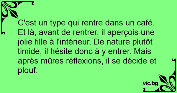 C'est un type qui rentre dans un café. Et là, avant de rentrer, il aperçois une jolie fille à l'intérieur. De nature plutôt timide, il hésite donc à y entrer. Mais après mûres réflexions, il se décide et plouf.