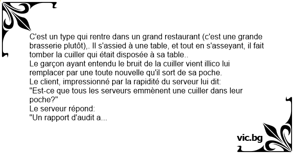 C'est un type qui rentre dans un grand restaurant (c'est une grande brasserie plutôt),. Il s'assied à une table, et tout en s'asseyant, il fait tomber la cuiller qui était disposée à sa table..
