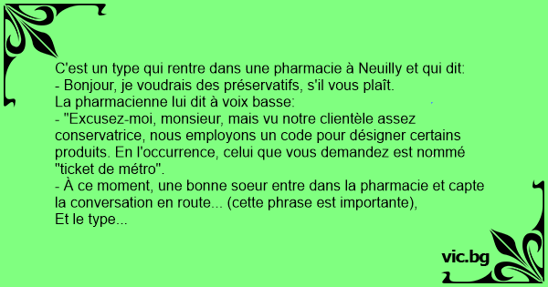 - "Excusez-moi, monsieur, mais vu notre clientèle assez conservatrice, nous employons un code pour désigner certains produits. En l'occurrence, celui que vous demandez est nommé "ticket de métro".