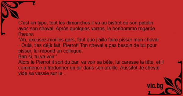 C'est un type, tout les dimanches il va au bistrot de son patelin avec son cheval. Après quelques verres, le bonhomme regarde l'heure: