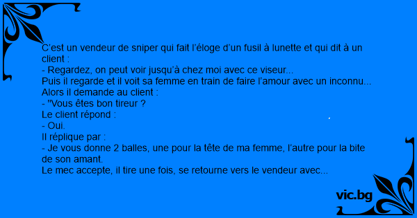 C’est un vendeur de sniреr qui fait l’éloge d’un fusil à lunette et qui dit à un client :