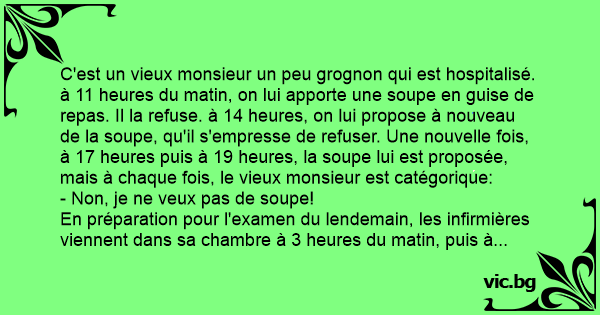 C'est un vieux monsieur un peu grognon qui est hospitalisé. à 11 heures du matin, on lui apporte une soupe en guise de repas. Il la refuse. à 14 heures, on lui propose à nouveau de la soupe, qu'il s'empresse de refuser. Une nouvelle fois, à 17 heures puis à 19 heures, la soupe lui est proposée, mais à chaque fois, le vieux monsieur est catégorique: