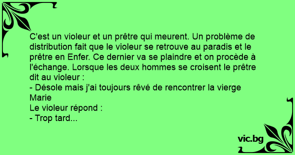 C'est un violeur et un prêtre qui meurent. Un problème de distribution fait que le violeur se retrouve au paradis et le prêtre en Enfer. Ce dernier va se plaindre et on procède à l'échange. Lorsque les deux hommes se croisent le prêtre dit au violeur :