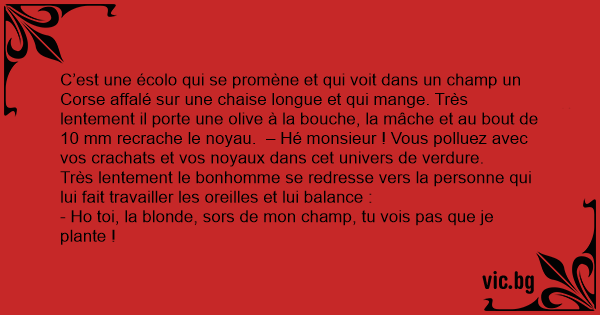 C’est une écolo qui se promène et qui voit dans un champ un Corse affalé sur une chaise longue et qui mange. Très lentement il porte une olive à la bouche, la mâche et au bout de 10 mm recrache le noyau.  – Hé monsieur ! Vous polluez avec vos crachats et vos noyaux dans cet univers de verdure.